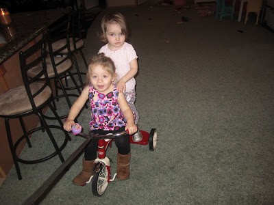 So, Taylor had to practice 2 weeks before Christmas and did not have her binky. It was pretty rough the first 5 nights or so. She was seriously like a druggie that needed her fix. She had a really hard time, but then the power of the tricycle won her over and she was willing to give it up. The good news is that Santa would give her binkys to a little baby that needed it. So, she chose sweet baby Nora to give them too. She's a cute little girl in our ward, that does